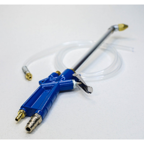 Этот пневматический инструмент обладает способностью отмывать загрязнения в самых труднодоступных местах моторного отсека благодаря своему изогнутому носику и высокому давлению. Пистолет оборудован шлангом длиной 120 см для комфортного погружения его в канистру с химическим раствором.